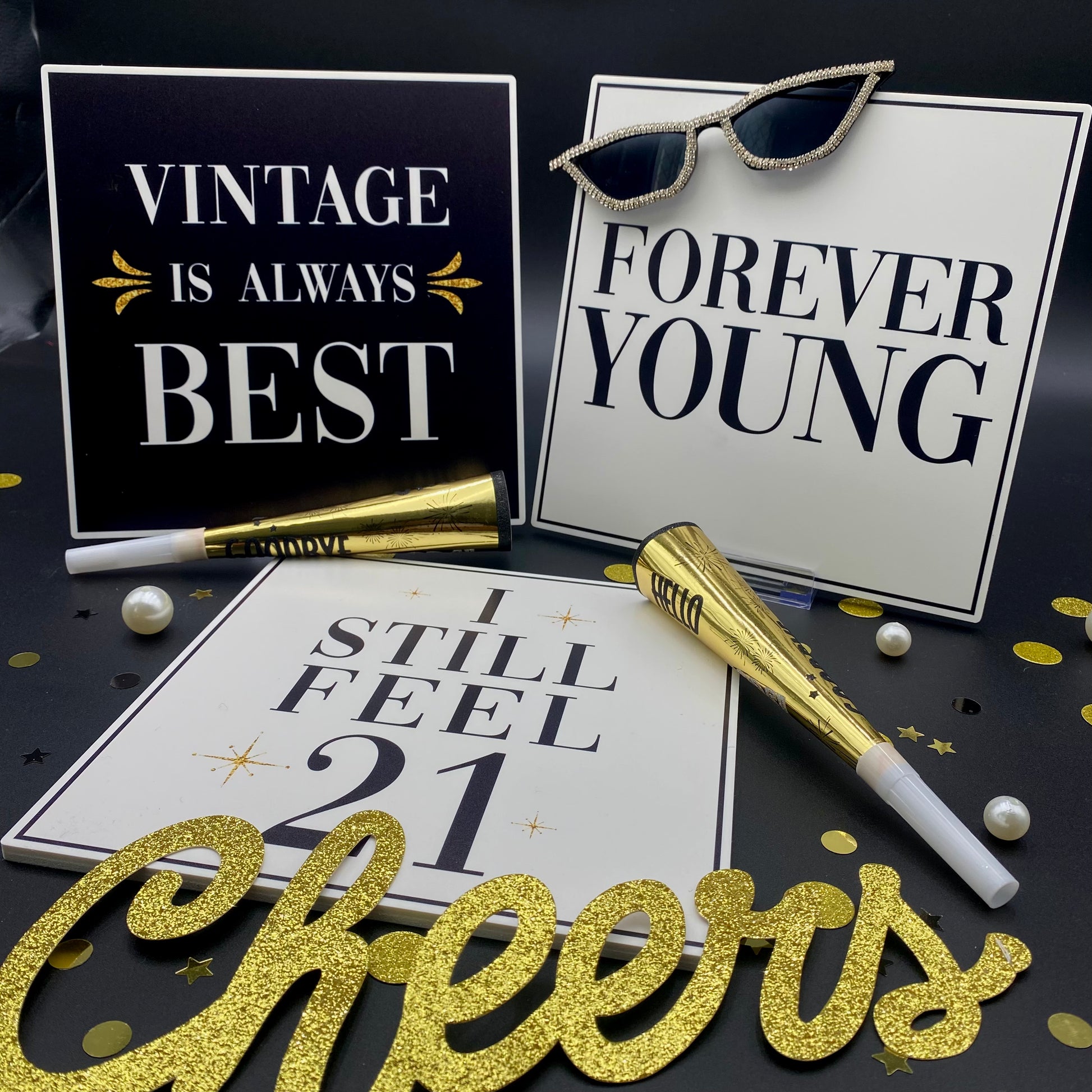 Timeless looks. Iconic moments. The Aged to Perfection prop set adds just the right touch of wit and elegance for milestone birthdays. Designed for mature celebrants who keep it classy, this collection delivers upscale charm with a playful twist—because confidence never goes out of style.